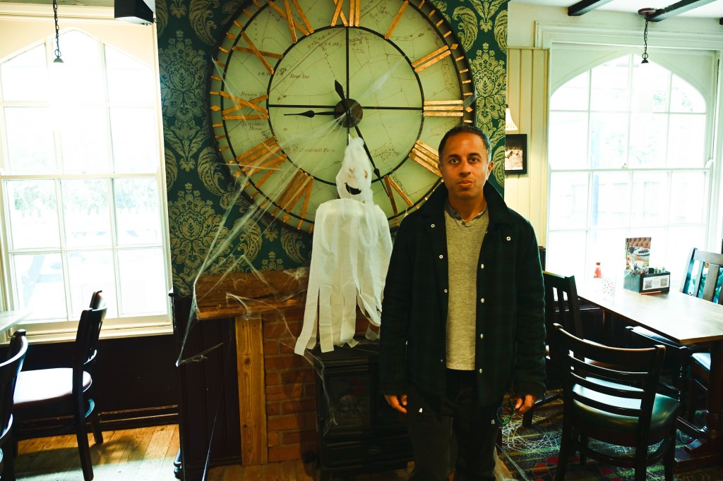 After the forest, with its beautiful light and soothing smells and ambience, and after watching the little trickle that was the river Rom, the next thing, we were sitting in a pub called The Deer’s Rest which was in Romford itself. The whole pub was tricked out in Halloween decor. I got us some drinks and downed an ice cold Pepsi. It was absolutely delicious in a way that Cola is not always. My friend told me that I had worked enough so my body was rewarding me for the work with that delicious sensation. He said that he was having it with his drink as well. The pub had this wallpaper of framed butterfly specimens and it was something that I quite wanted for myself as I thought it looked very sophisticated and cool. And much nicer than real specimens of butterflies which I have always found slightly creepy. Because they are dead beauty.